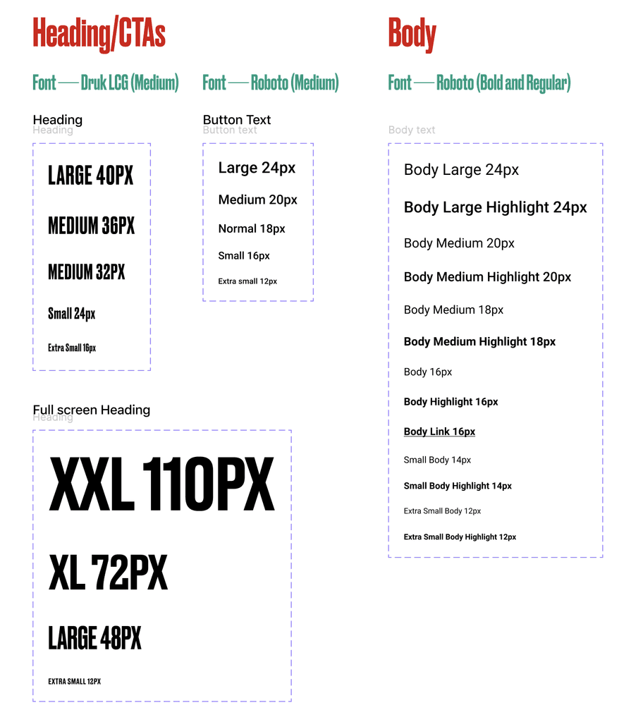 In Figma, I crafted wireframes using basic shapes and colours, allowing for effortless transformation into detailed mock-up screens at a later stage. We had finalised the font usage for heading (Druk) and body (Roboto).