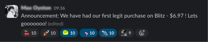 Player purchase moments shared by the Product Team on Slack.