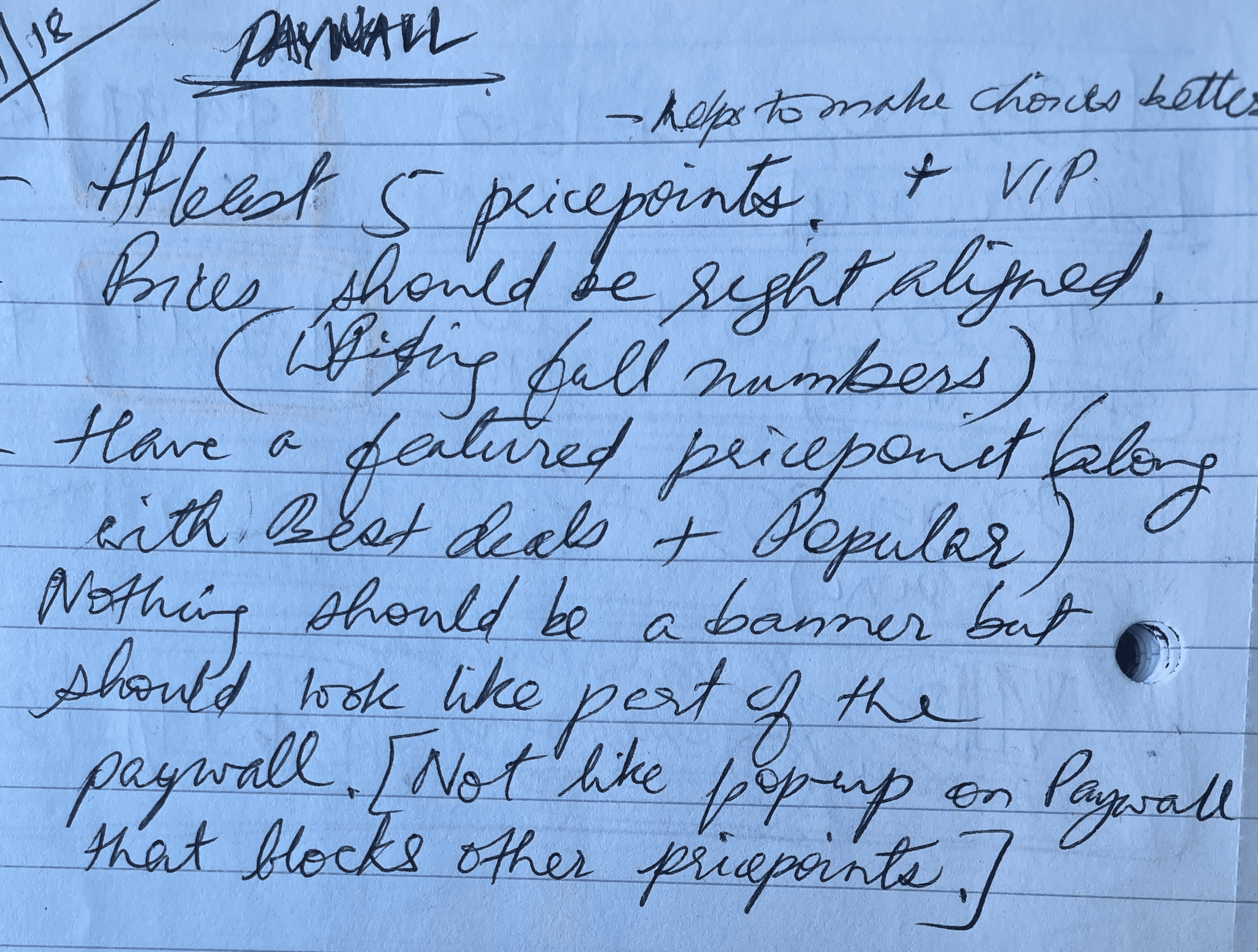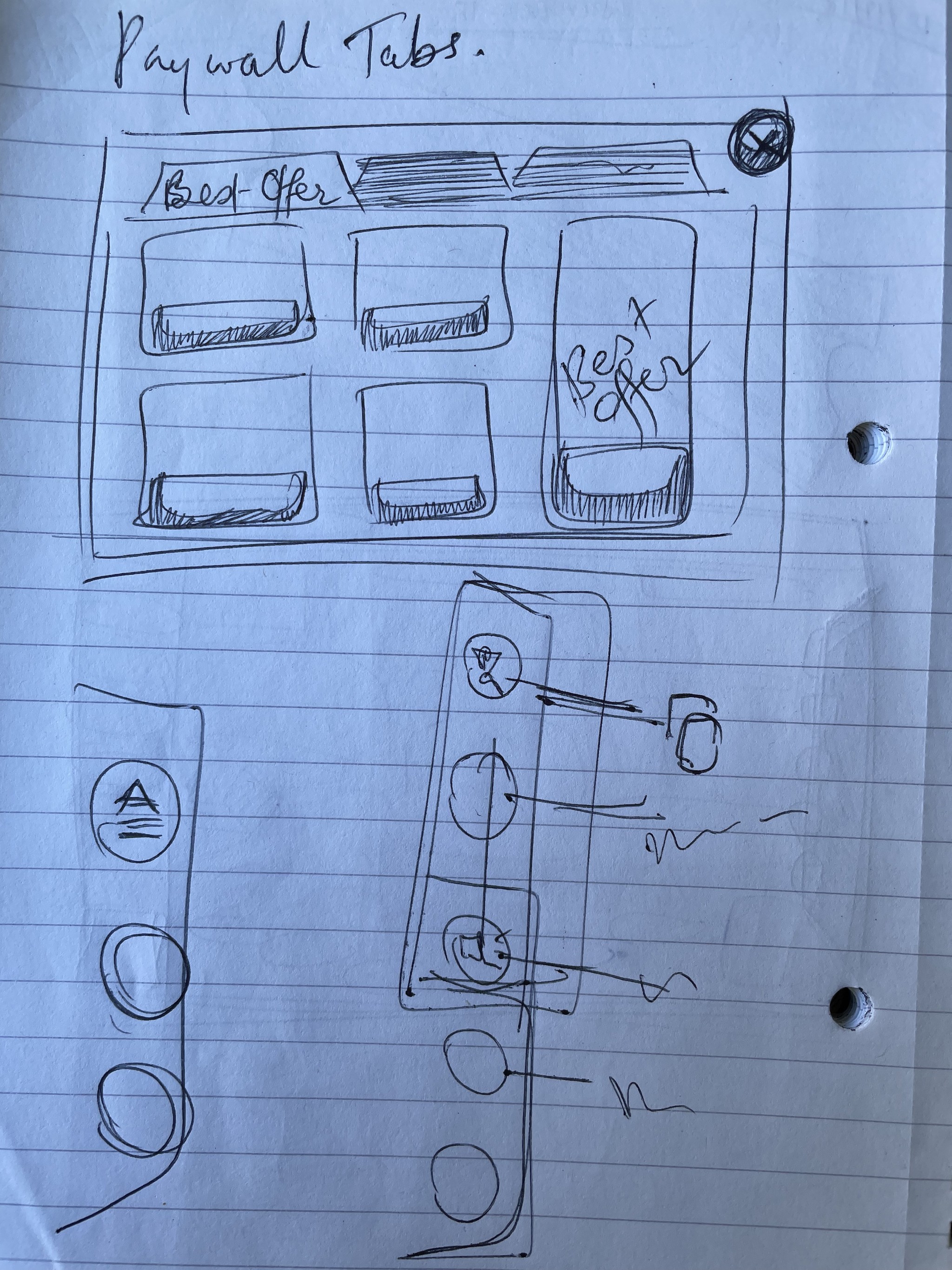 After deriving conclusions based on competitor analysis, I did many paper wireframes to look at possible solutions of the re-designed paywall.